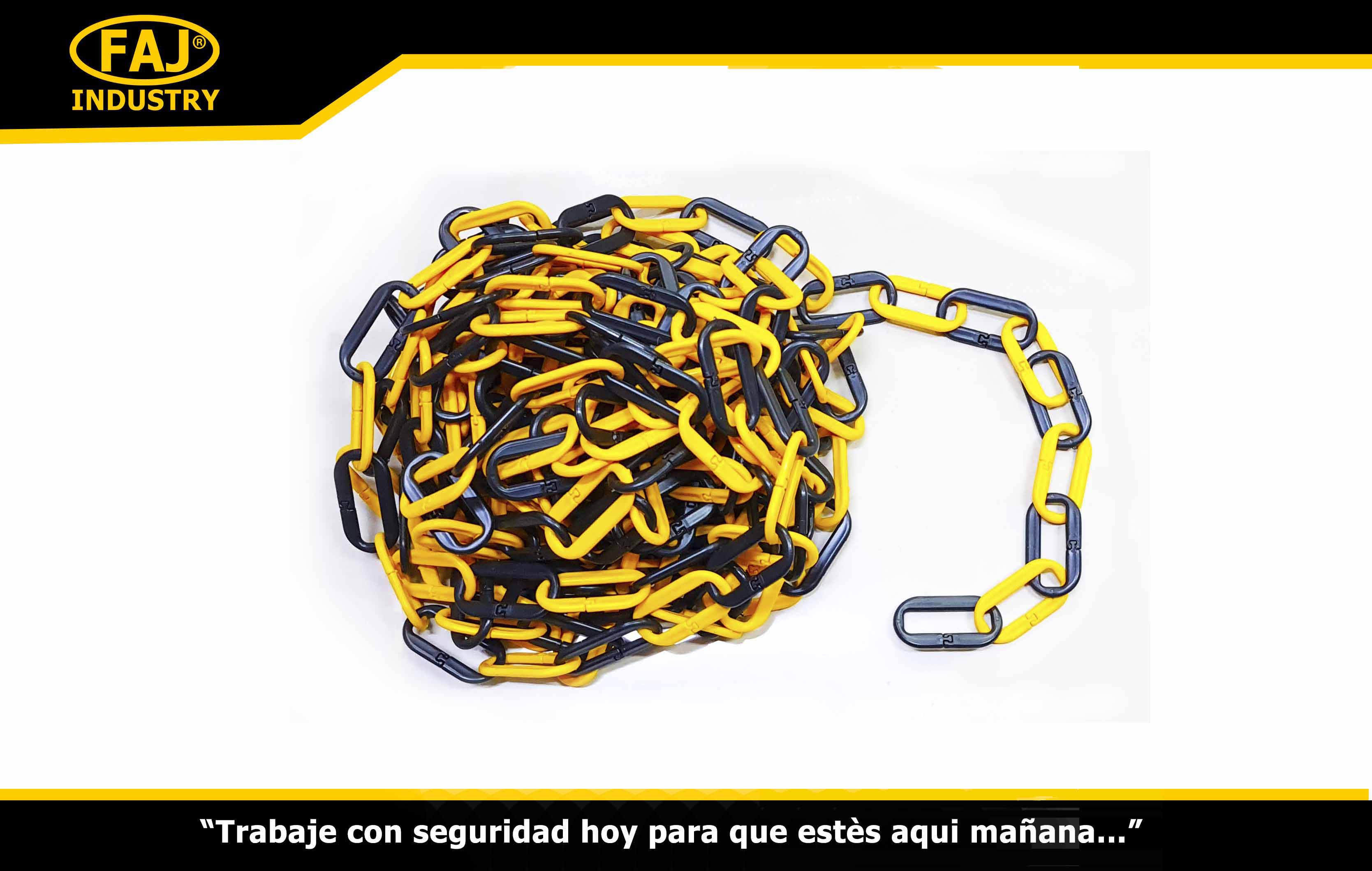 • Cadenas hechas en plástico en combinaciones amarillo-negro. Estas cadenas pueden usarse para delimitar espacios y zonas de circulación, señalizar, vallar y demarcar. Se acoplan a las columnas de señalización. Suelen implementarse en salidas de estaciones de peaje, cruces peatonales, estaciones de servicio, incluso para dividir multitudes en filas ordenadas.