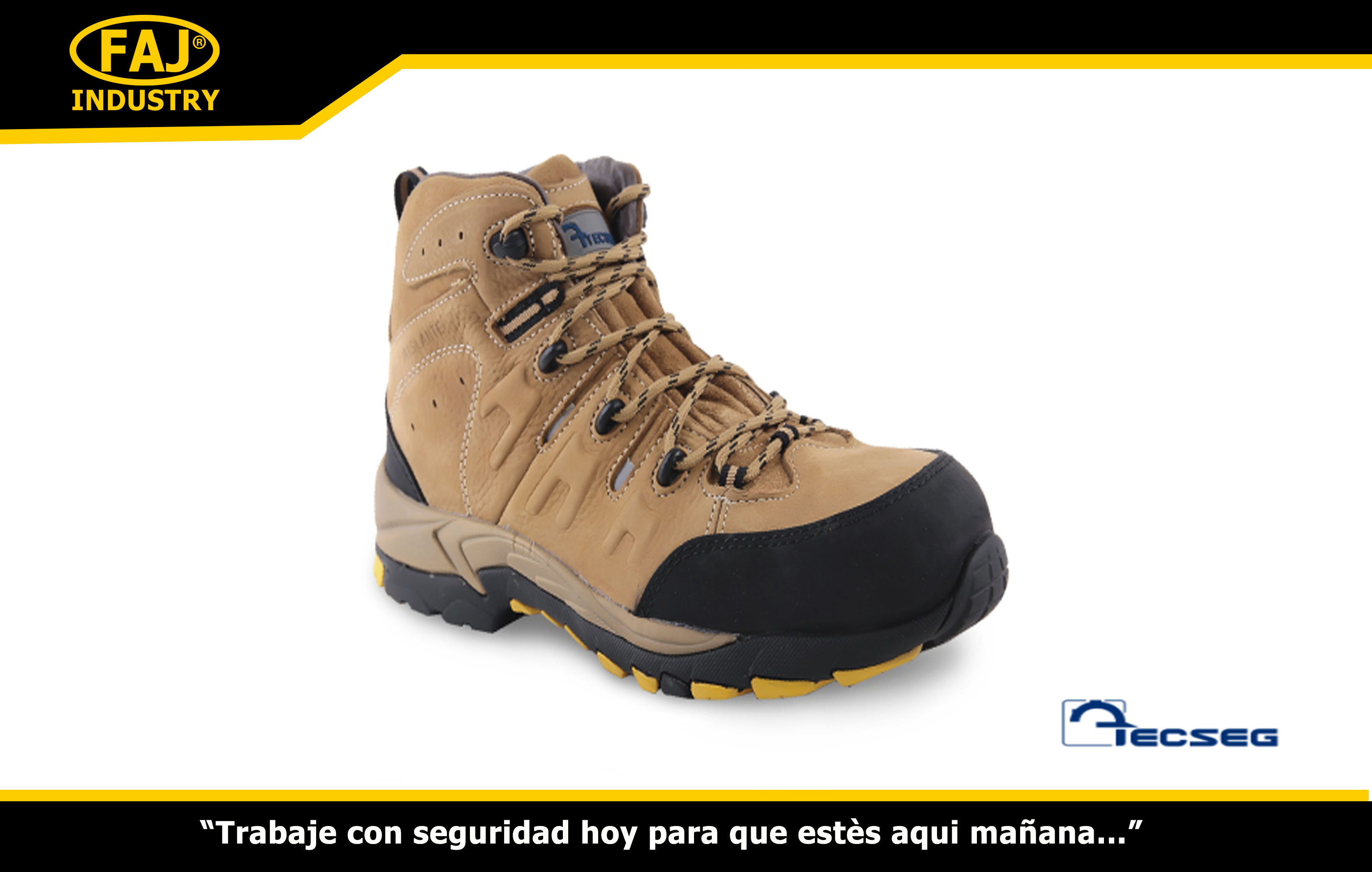 Calzado de seguridad, fabricado bajo el sistema cementado, capellada 100% cuero hidrofugado, suela de caucho nitrilo antideslizante, dieléctrica y resistente a